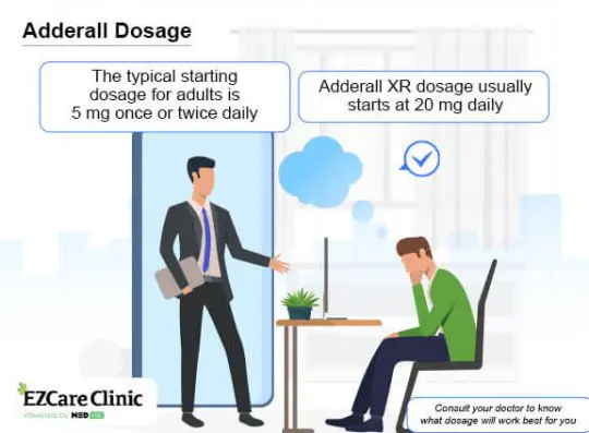 Dosage | 18 mg to 36 mg taken once by mouth daily. The daily dose should not exceed 72 mg | The initial Adderall dosage is 5 mg to 19 mg for immediate-release tablets (taken once or twice daily). It can be increased by 5 mg weekly until the desired outcome is achieved. The maximum daily dosage is 60 mg. The starting dose is 20 mg once daily for slow-release capsules. |