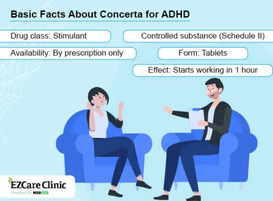 That said, the onset of effects differs between the medications. If you take the immediate-release Adderall tablet, it usually takes 30 minutes to work and peak blood concentration occurs within 3 hours, and the effect starts to wear off. On the other hand, Concerta for ADHD begins to work within an hour, with the effect lasting about 6-10 hours. That’s why the immediate-release Adderall formulation is taken multiple times a day, while Concerta is only taken once daily.