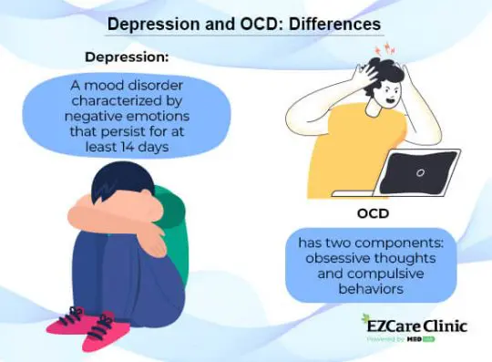 - OCD is distinguished by its two main components, obsessive thoughts and compulsive, repetitive actions, while depression does not portray any repetitive physical reactions or symptoms.