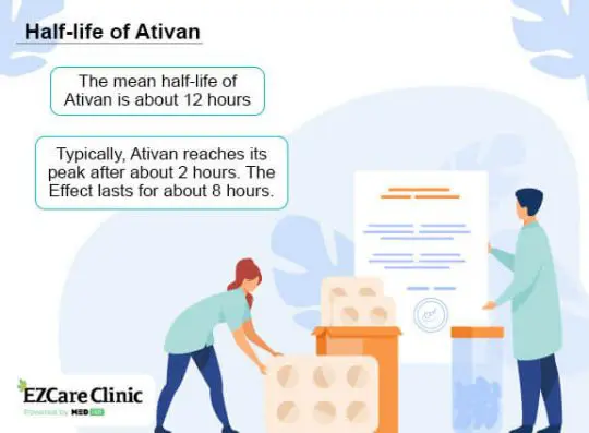 The half-life of lorazepam, the active ingredient in Ativan, ranges from 12 to 15 hours. That means it takes an average of 12-15 hours for half of the dose taken to be eliminated from the body. Ativan’s half-life doesn’t vary too far from this range, taking an average of 12 hours for half of the dose to be eliminated.