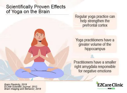 smaller amygdala[5] , which is responsible for emotions, emotional behavior, and motivation.The studies[6] suggest that yoga practitioners can exert cognitive control over emotional processes, which helps avoid concentrating on the negative sides of the matter and be rational about the matter instead. - Brain networks, including the default mode network (DMN). Such physical activity as yoga is effective at connecting the regions of the DMN. It increases verbal memory recall and is especially useful for aging people.