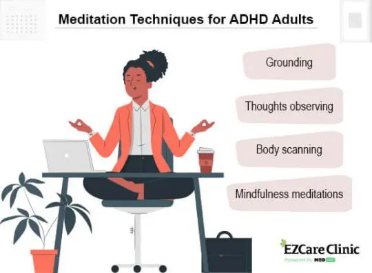 - Thoughts observing. Many adults with ADHD can find it difficult to manage their thoughts. There can be a lot of thoughts at once, but it can be hard to focus on just one. So, relax and watch your wandering thoughts change — this is how you learn to meditate.