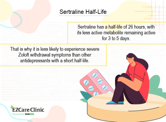 Sertraline works by preventing the reabsorption of serotonin, which increases its levels in the brain. When a patient stops taking the medication abruptly, serotonin levels start dropping, and they finally return to pretreatment training. As such, their body and mind try to adapt to this sudden change leading to withdrawal symptoms. Sertraline has a half-life of about one day (26 hours), with its less active metabolite remaining active for 3 to 5 days. That is why it is less likely to experience severe Zoloft withdrawal symptoms than other antidepressants with a short half-life like paroxetine and fluvoxamine because it takes longer for the patient’s system to clear this drug than other SSRIs with a shorter half-life.
