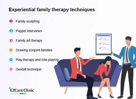 There are several interesting interactive techniques used in experiential family therapy. Their purpose is to increase the involvement and insight of the therapy members.