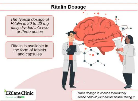 Ritalin medication is prescribed in tablet and capsule form. The average dosage for an adult is between 20 to 30 mg daily. It is administered orally and divided into two or three doses depending on the diagnosis.